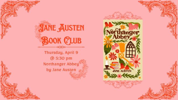 Thursday, April 9th @ 4:30 pm The Jane Austen Book Club is the second Thursday of every month. We will be reading through all of Jane Austen’s works. For April…