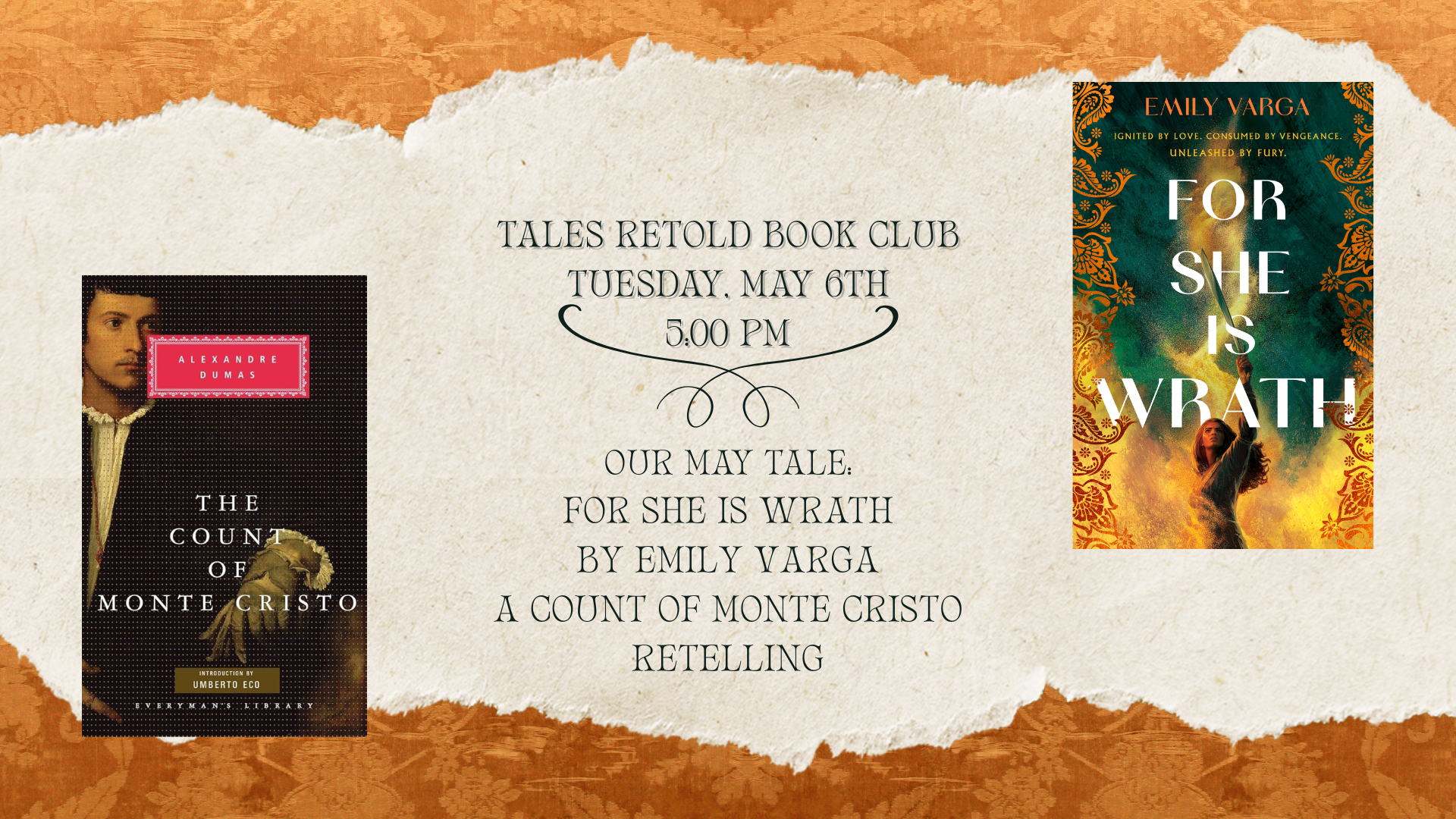 We will be meeting on the first Tuesday of every month, to read and discuss original works and spin-offs or retellings based on them. Our May pick is a Count of Monte Cristo retelling. For She Is Wrath by Emily Varga. Summary: Framed for a crime she didn't commit, Dania counts down her days in…